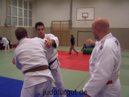 Am Sonntagmorgen fiel es den anwesenden Sportlern sichtlich schwer die Müdigkeit abzulegen. Doch Frank überzeugte mit seiner Vorstellung des Uchi Mata’s und riss alle Judoka mit in seinen Bann. Auch hier zeigte sich die jahrelange Erfahrung die autodidaktische Meisterleistung des 7. DAN s wieder einmal. Durch die vielen „Kleinigkeiten“, die Frank über die Jahre hinweg für sich an dieser Technik änderte, ist diese Version des Wurfes einfach geworden und wieder unheimlich effektiv. Im Boden zeigte Frank diesmal, wie man die Kraft des Partners für sich ausnutzen kann. Mit Hilfe dieser Technik gelang es dem Trainer seinen Partner recht schnell von der Bauch- in die Rückenlage zu befördern und ihn erfolgreich dort zu halten.