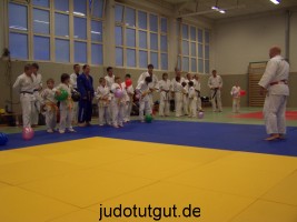 fest: Wir fahren nach Pineberg. Am Samstag ging es dann recht früh los. In Pinneberg angekommen verlief alles sehr professionell. Turnierpässe wurden gekauft, die Kämpfer wurden gewogen und nach 10 Minuten war alles erledigt. Pünktlich zur Begrüßung waren die ersten Listen fertig... (VORBILDLICH)! Es ging auch gleich für 3 Judoka auf die Matte. Eine Tatsache, die auch Trainer Peter einiges abverlangte, Tjark kämpfte auf Matte 4; Simon auf Matte 3; Lukas auf Matte 1. Teilweise alle zur gleichen Zeit. Da kamen einige Meter zusammen, um auch jeden Schützling coachen zu können. Lukas hatte wie Simon eine starke Gruppe erwischt und konnte sich leider im ersten Kampf nicht so recht durchsetzen. Im zweiten Kampf hatte er einen besseren Start erwischt und konnte die Tipps von Peter schon gut umsetzen. Er ging in Führung, musste diese aber leider kurz vor Schluss wegen einer "grenzwertigen" Kampfrichterentscheidung abgeben. Somit erkämpfte sich Lukas Platz 3. In Simons Gruppe waren auch schon ein paar ältere Hasen am Start, die sehr routiniert auf die Matte gingen. Simon, der mit einer kleinen Blessur am Auge startete lies sich aber nichst anmerken und ging wie gewohnt offensiv in die Kämpfe. Den ersten Kampf musste er jedoch abgeben, zu stark war sein Gegenüber. In den weiteren Kämpfen besann sich Simon auf seine Stärken und zeigte sehenswerte Hüfttechniken. Leider musste er im letzten Kampf verletzungsbedingt nachgeben und konnte so einen starken dritten Platz erreichen. Tjark lies in seiner gewichtsklasse nichts anbrennen, der Vizelandesmeister marschierte siegessicher Richtung Treppchen und bezwang seine Gegner alle in sehr kurzer Zeit. Allein der letzte Kampf dauerte (auch ihm) etwas zu lange. Doch er gewann alle Kämpfe und sicherte sich so den 1. Platz!